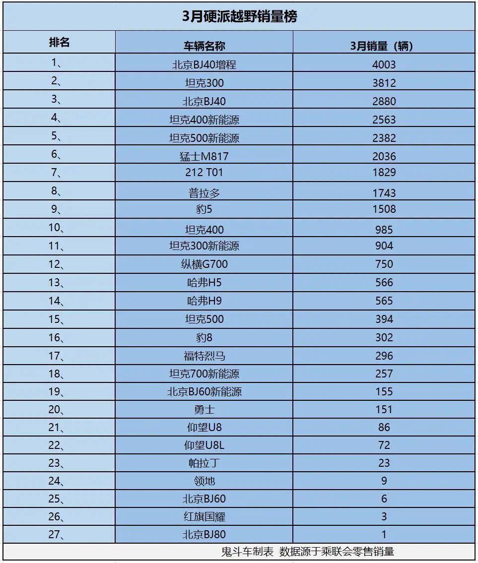 销量就是最好的体现,日前,乘联会发布3月车市零售销量数据,鬼哥整理出3月硬派越野销量榜,结果发现,整个榜单上,没有一款硬派越野销量超过5000辆,真是有点儿惨淡。接下来,看看具体车型排名与销量表现。